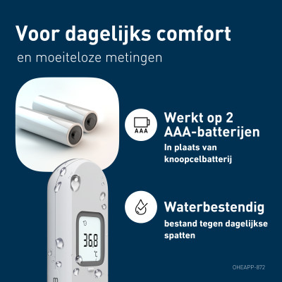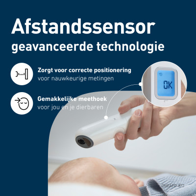 Ontworpen voor families die snelle, contactloze temperatuurcontroles uitvoeren met nauwkeurigheid en gemak. Dankzij de geavanceerde afstandssensortechnologie kun je snel en nauwkeurig meten zonder contact te maken. De afstandssensor zorgt voor een correcte positionering voor betrouwbare metingen en de volgende meting kan binnen 1 seconde worden uitgevoerd. De thermometer is stil, gemakkelijk met één hand te hanteren en ontworpen voor snel gebruik. Hij kan de temperatuur van het voorhoofd meten en de temperatuur van de vloeistof controleren. Hij slaat de laatste 30 temperatuurmetingen op. Hij werkt op 2 AAA-batterijen.