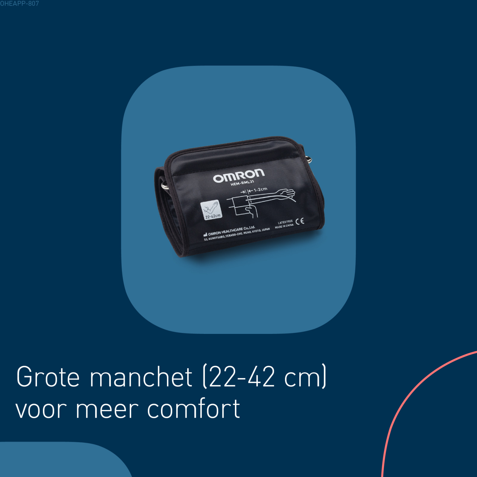 De universele manchet (22–42 cm) past om een brede reeks armmaten en levert betrouwbare resultaten, ongeacht hoe deze is geplaatst. Functies zoals onregelmatige hartslagdetectie en lichaamsbewegingdetectie verhogen de nauwkeurigheid door de kans op meetfouten te verkleinen.